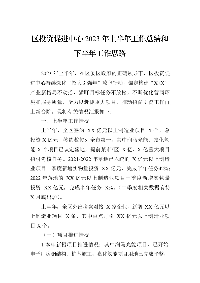 / 区投资促进中心2023年上半年工作总结和下半年工作思路