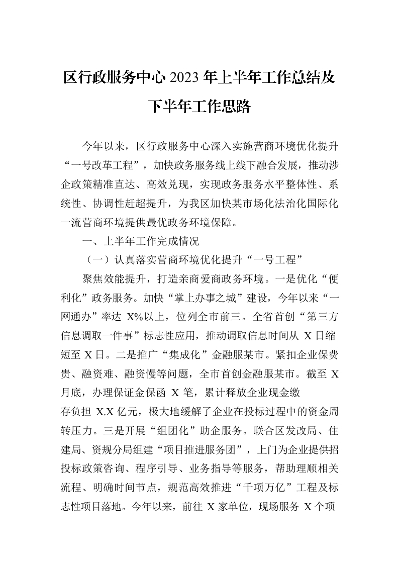 / 区行政服务中心2023年上半年工作总结及下半年工作思路(20230710)