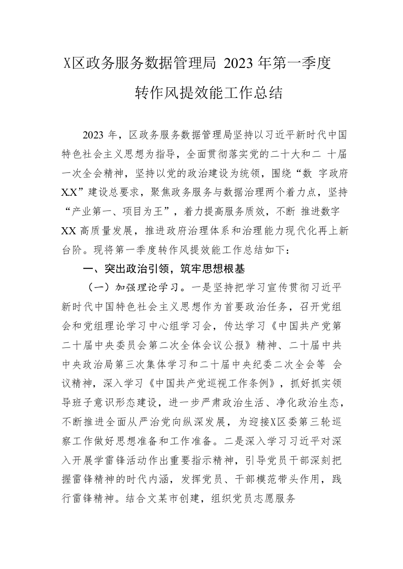 区政务服务数据管理局2023年第一季度转作风提效能工作总结