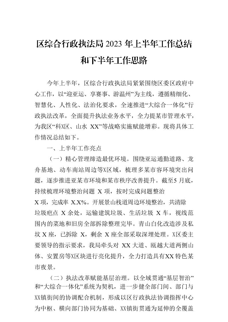 / 区综合行政执法局2023年上半年工作总结和下半年工作思路(20230704)