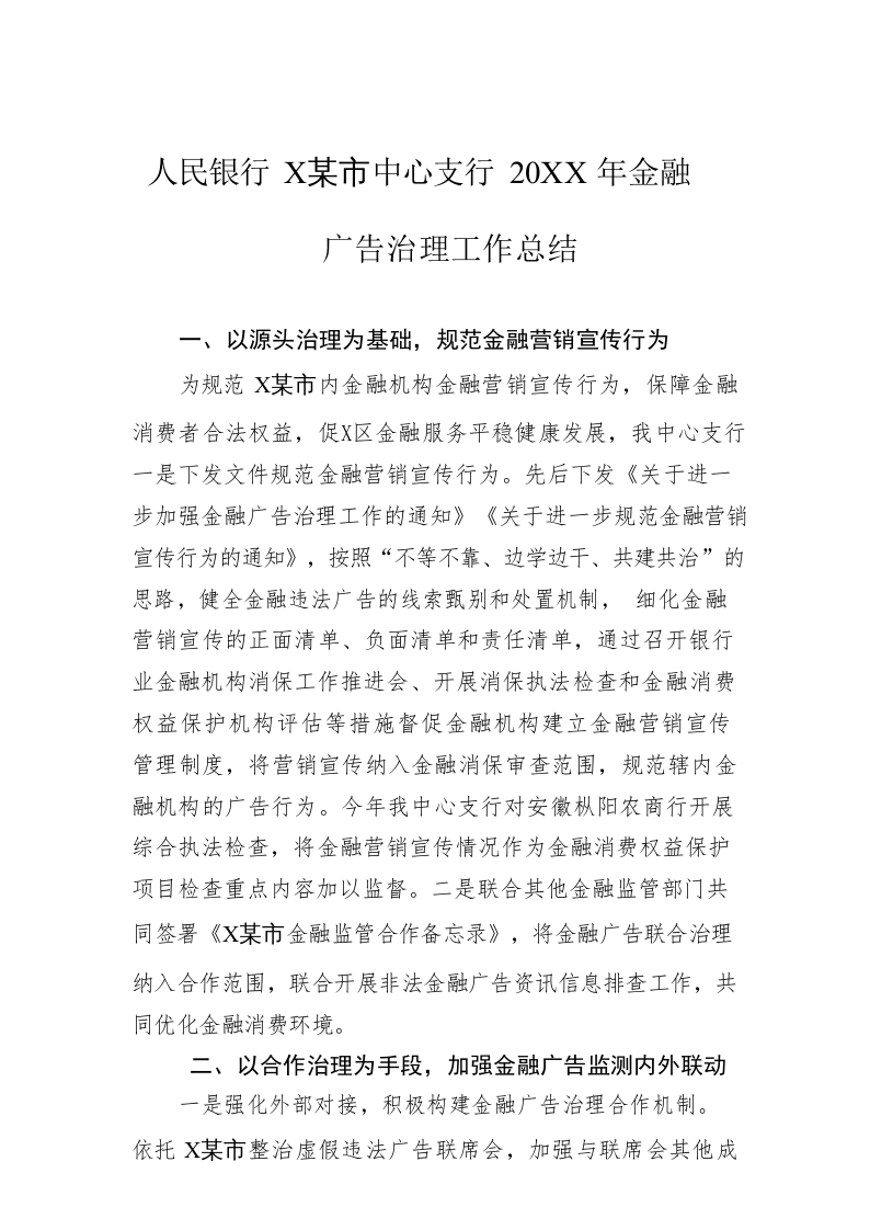 / 人民银行XX市中心支行20XX年金融广告治理工作总结