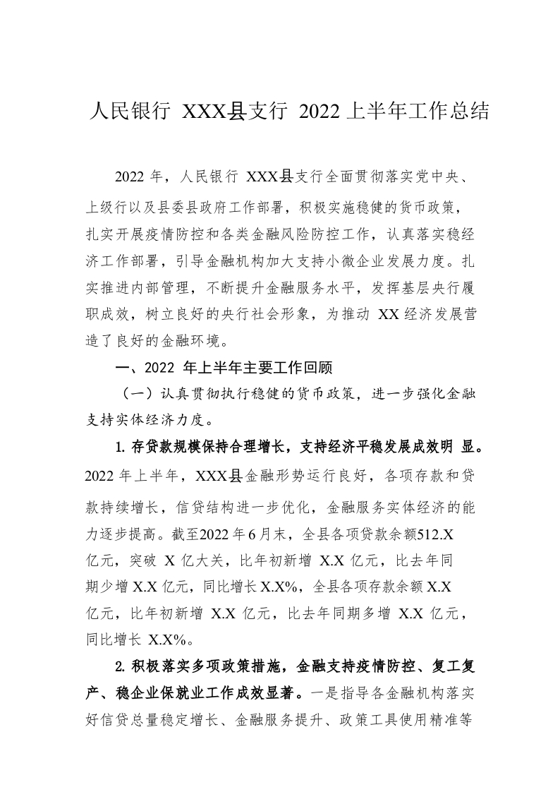 / 人民银行XX县支行2022上半年工作总结