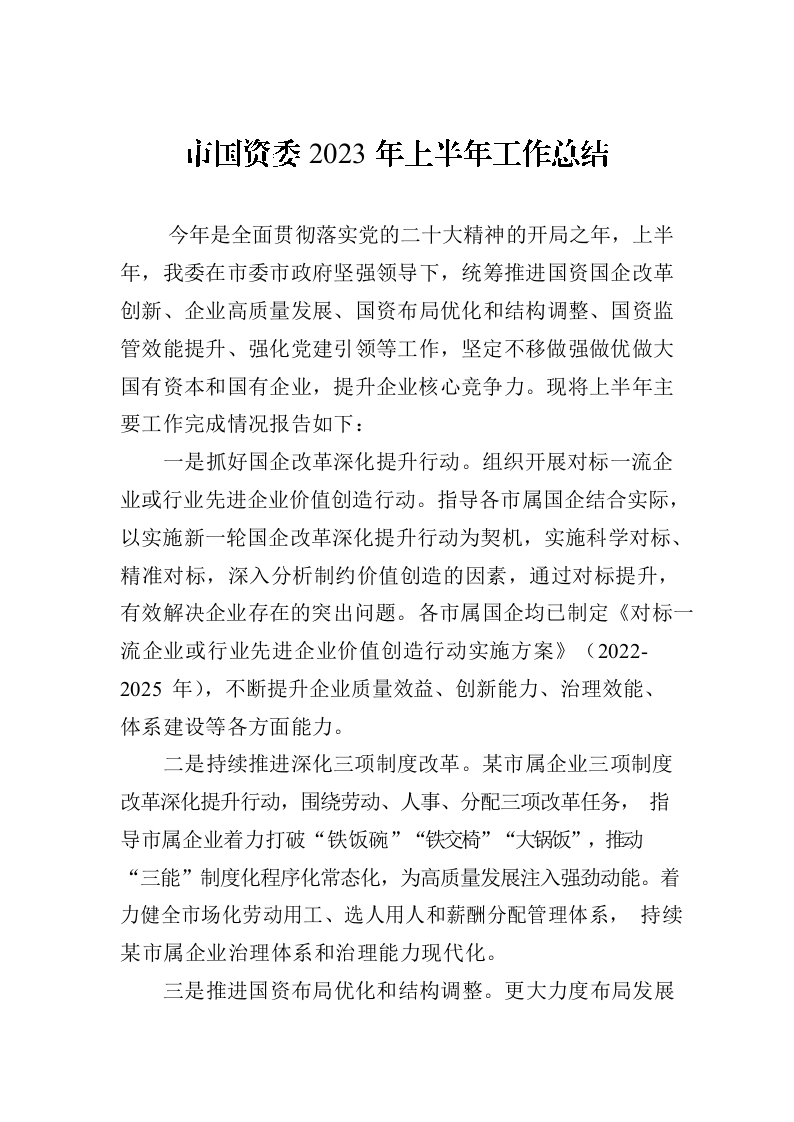 市国资委2023年上半年工作总结和下半年工作思路(20230705)