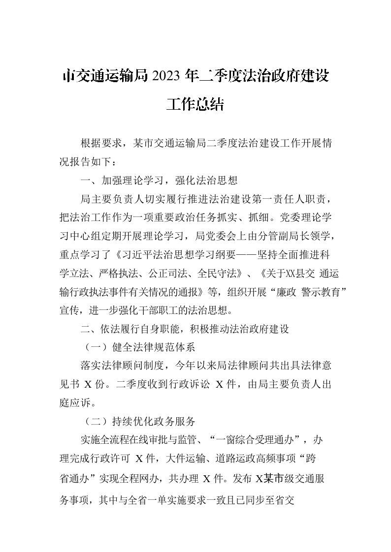 / 市交通运输局2023年二季度法治政府建设工作总结(20230707)