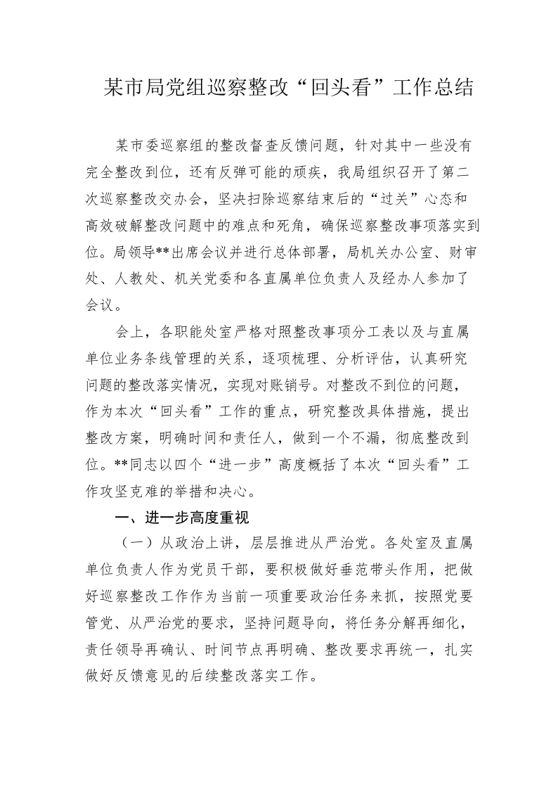 / 市局党组巡察整改“回头看”工作总结
