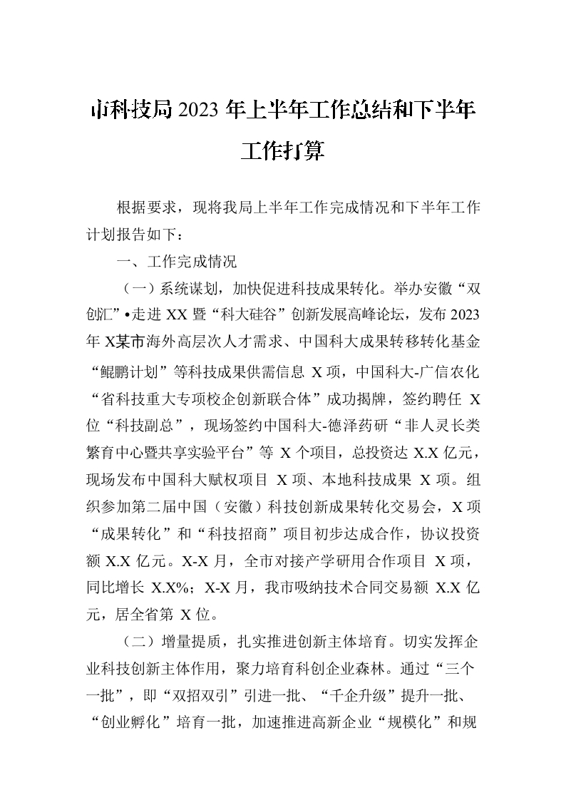 / 市科技局2023年上半年工作总结和下半年工作打算(20230705)
