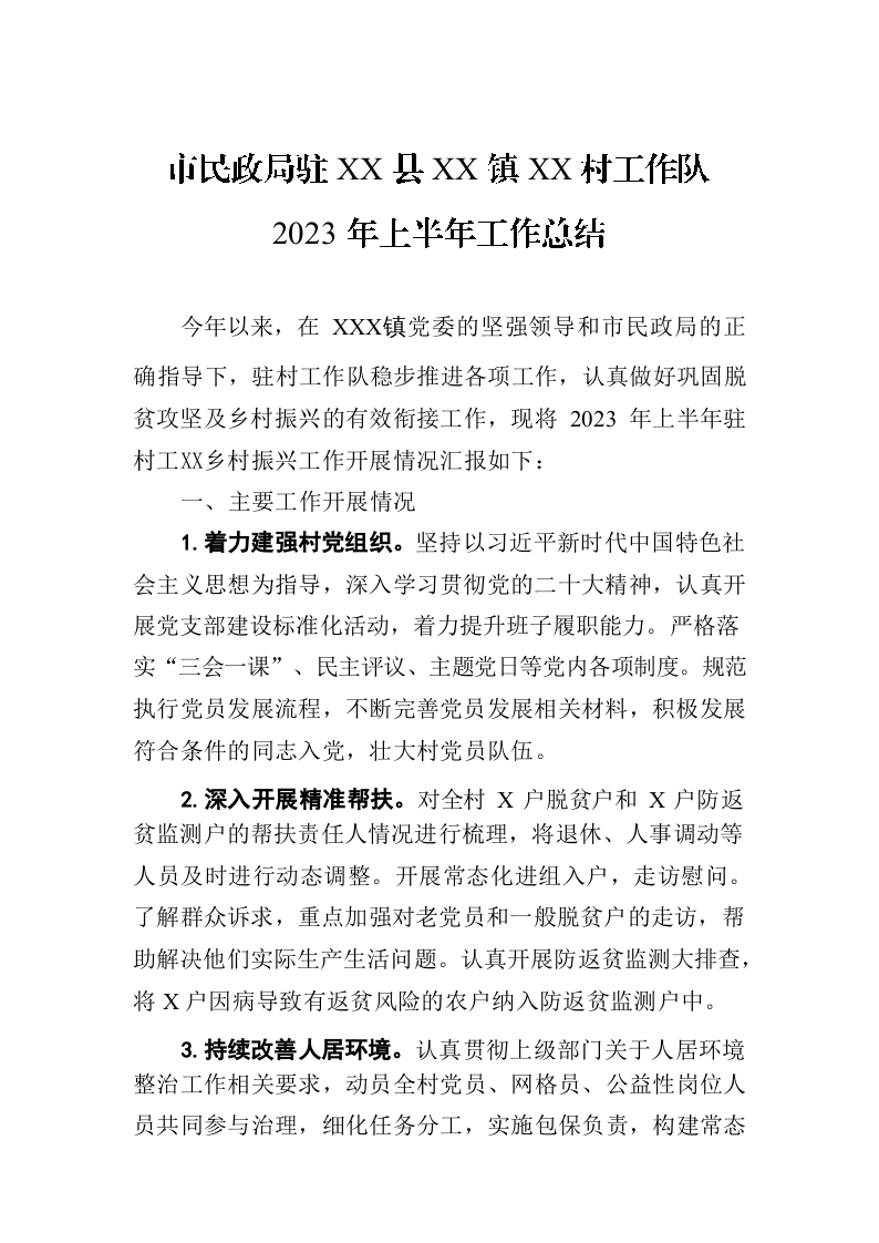 / 市民政局驻XX县XX镇XX村工作队2023年上半年工作总结