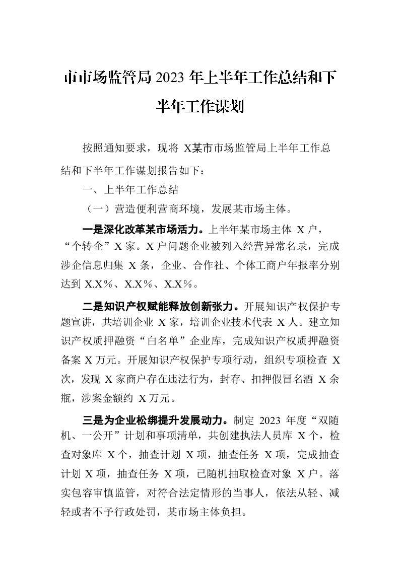 / 市市场监管局2023年上半年工作总结和下半年工作谋划