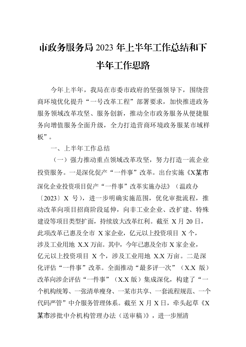 / 市政务服务局2023年上半年工作总结和下半年工作思路(20230709)