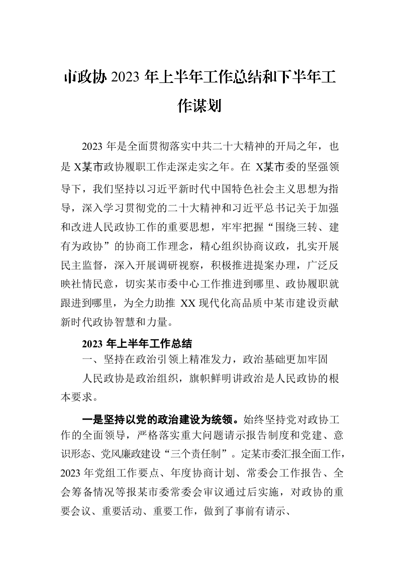 / 市政协2023年上半年工作总结和下半年工作谋划