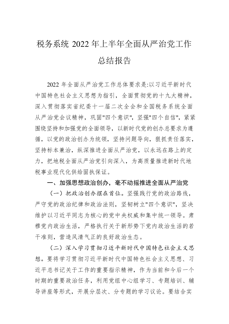 / 税务系统2022年上半年全面从严治党工作总结报告