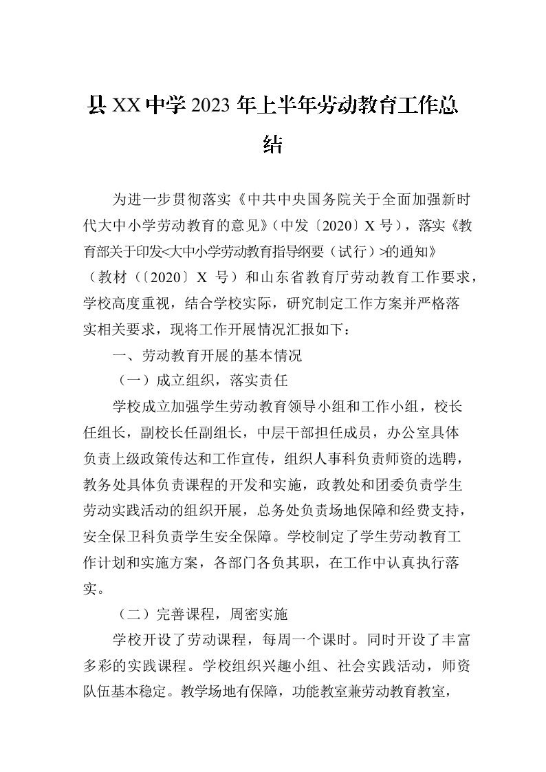 / 县XX中学2023年上半年劳动教育工作总结(20230708)