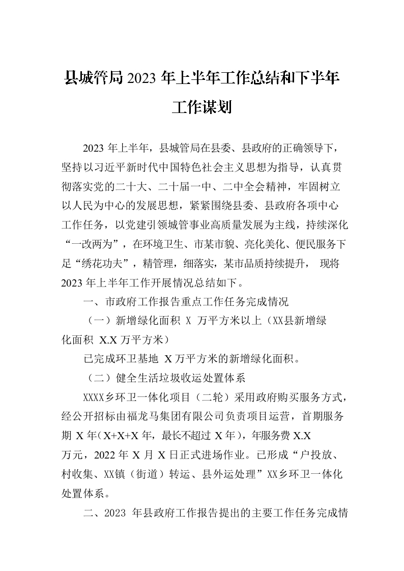 / 县城管局2023年上半年工作总结和下半年工作谋划(20230704)