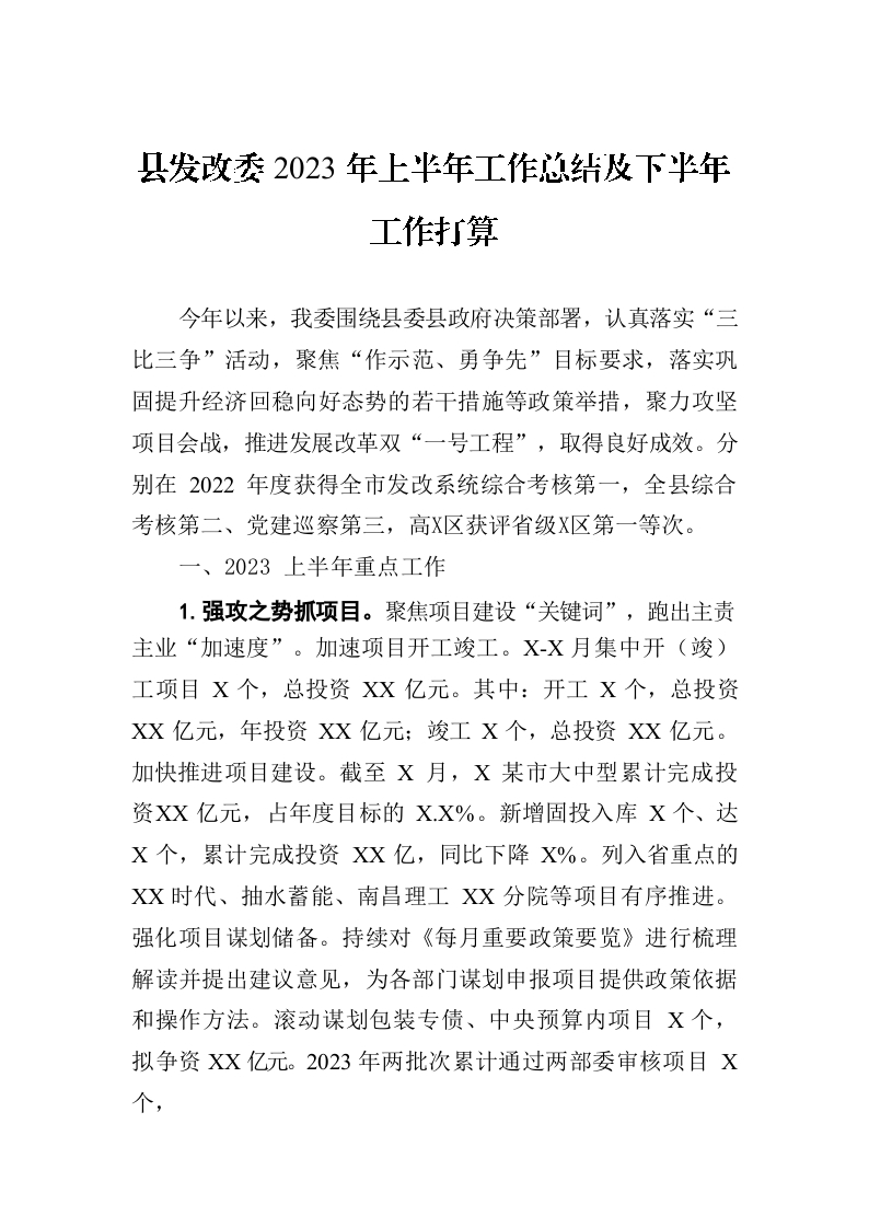 县发改委2023年上半年工作总结和下半年工作安排(20230704)