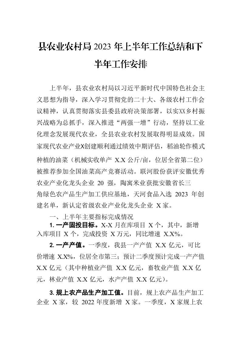 县农业农村局2023年度上半年工作总结和下半年工作安排(20230627)