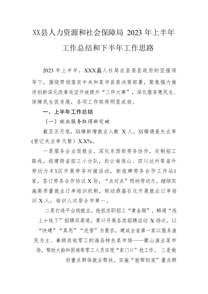 / 县人力资源和社会保障局2023年上半年工作总结和下半年工作思路(20230625)