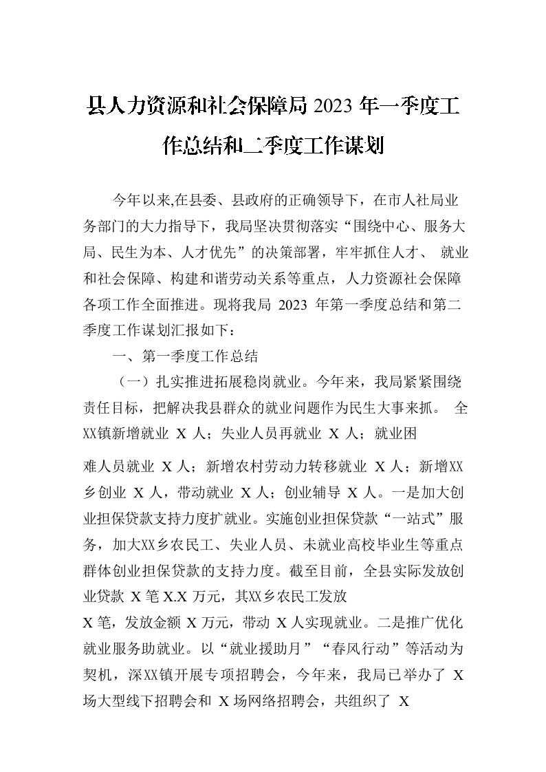 / 县人力资源和社会保障局2023年一季度工作总结和二季度工作谋划(20230329)