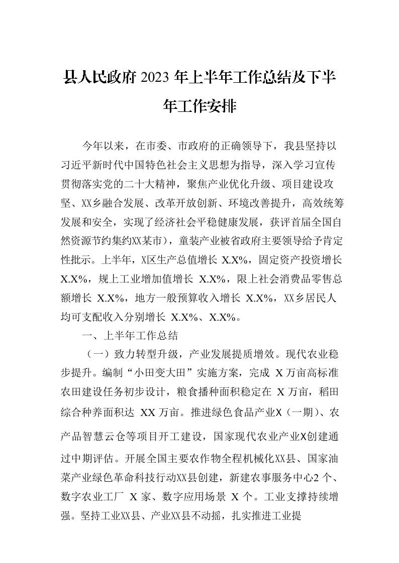 / 县人民政府2023年上半年工作总结及下半年工作安排