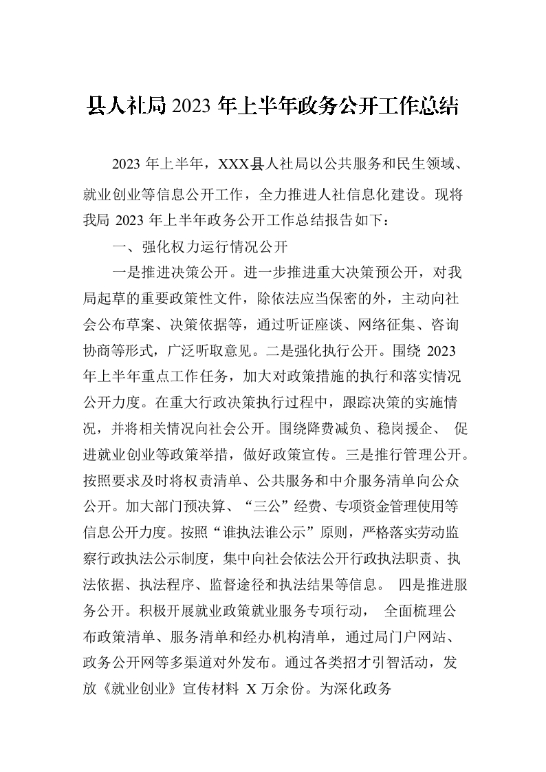 / 县人社局2023年上半年政务公开工作总结(20230707)
