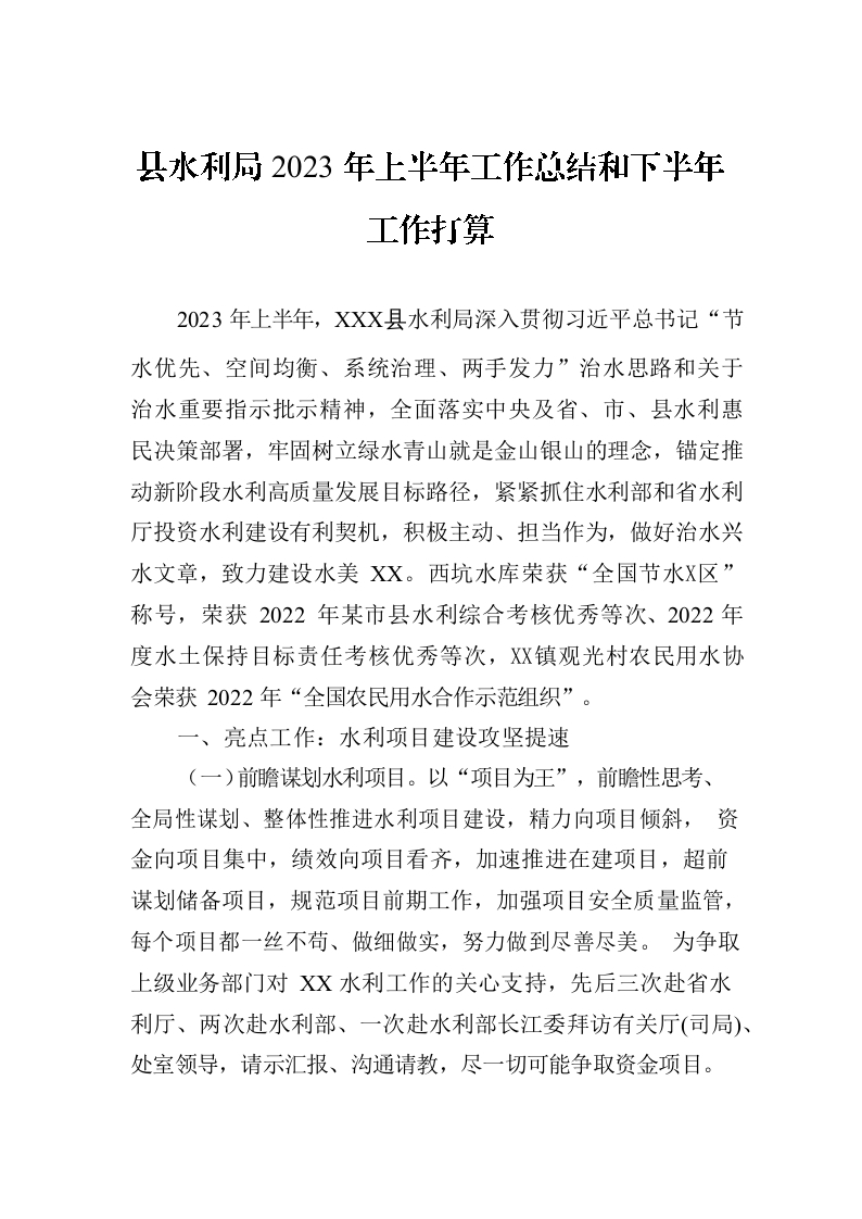 / 县水利局2023年上半年工作总结和下半年工作打算