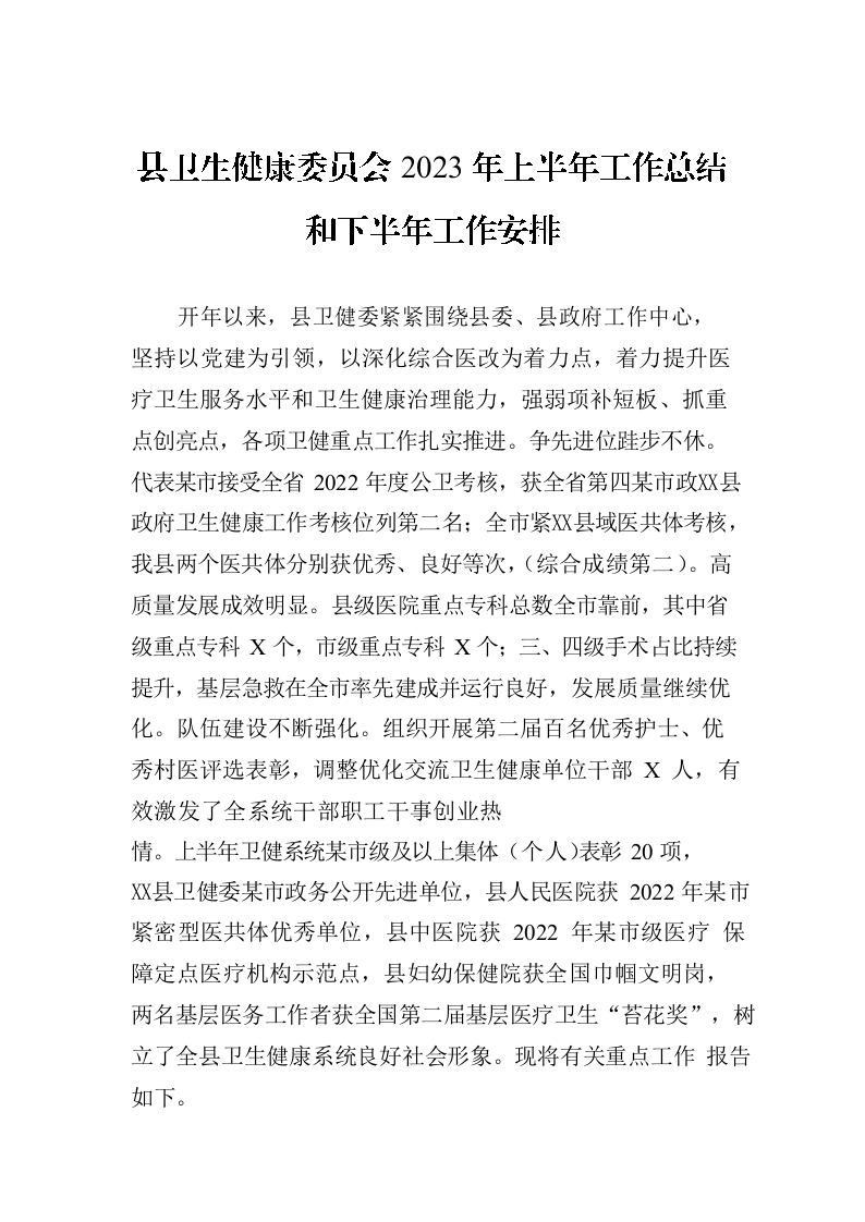 / 县卫生健康委员会2023年上半年工作总结和下半年工作安排(20230706)