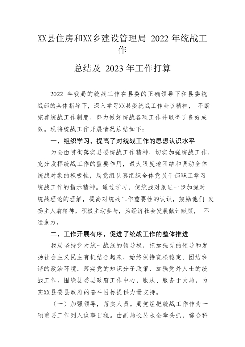 / 县住房和城乡建设管理局2022年统战工作总结及2023年工作打算