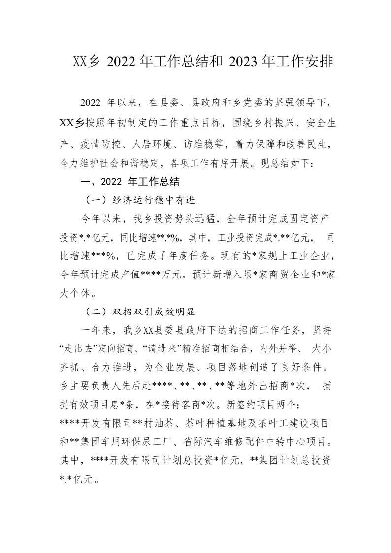 / 乡2022年工作总结和2023年工作安排