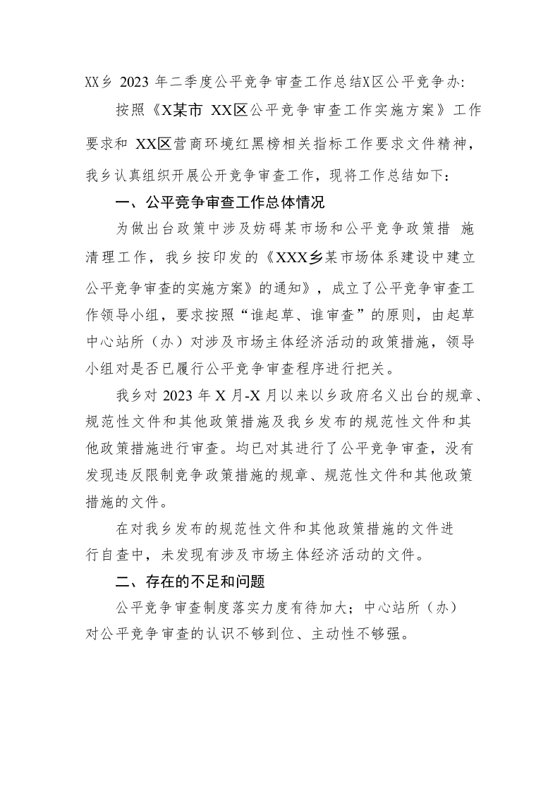 / 乡2023年二季度公平竞争审查工作总结(20230615)