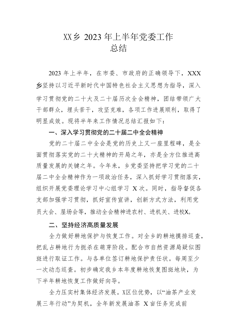 乡2023年上半年党委工作总结(20230621)