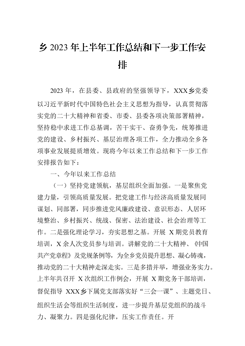 乡2023年上半年工作总结和下一步工作安排(20230620)