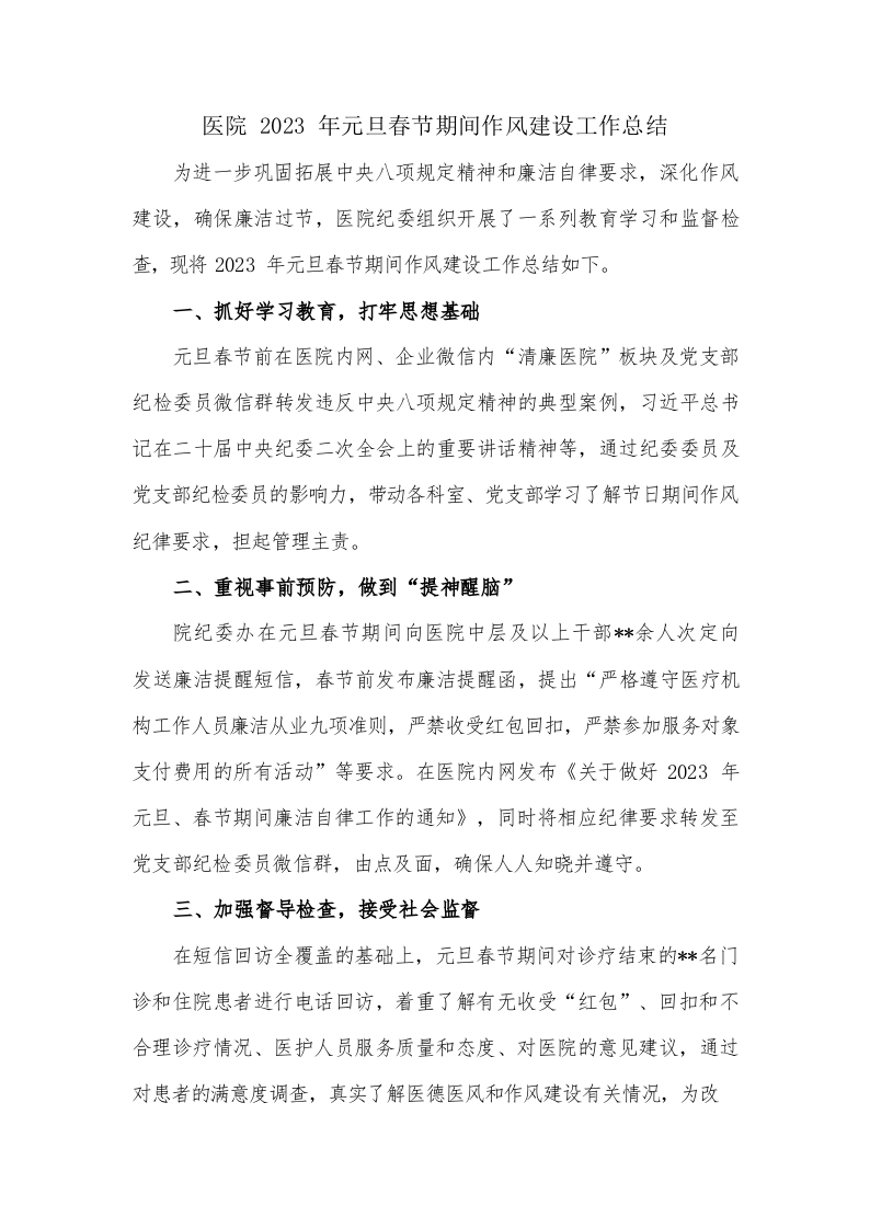 / 医院2023年元旦春节期间作风建设工作总结