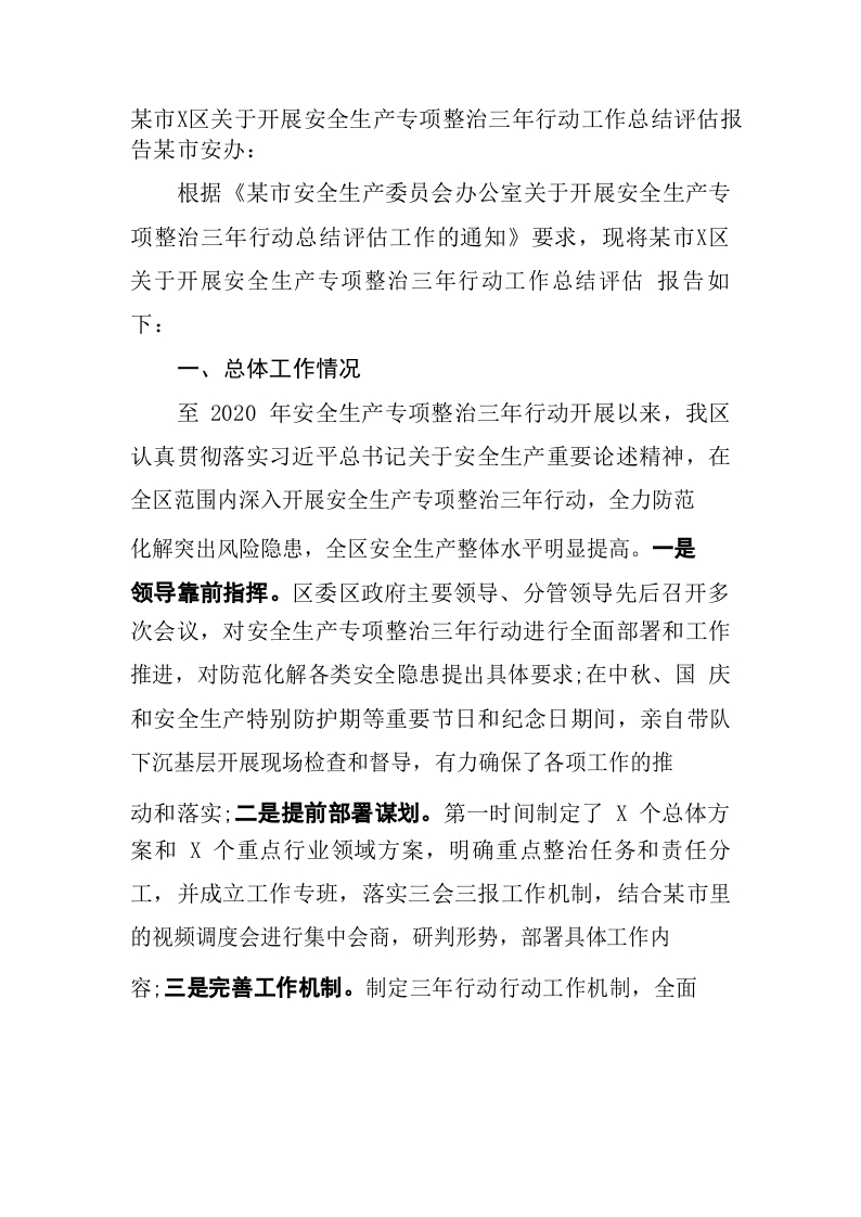 某市X区关于开展安全生产专项整治三年行动工作总结评估报告