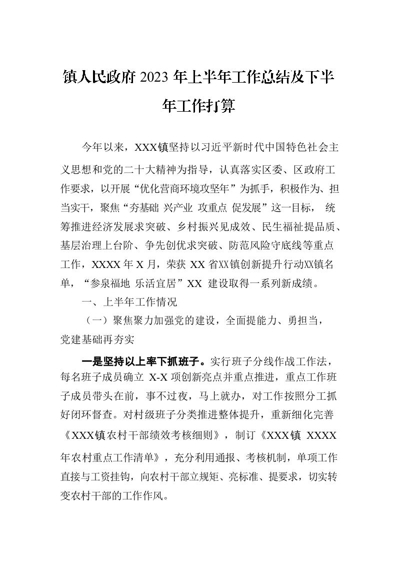 / 镇人民政府2023年上半年工作总结及下半年工作打算
