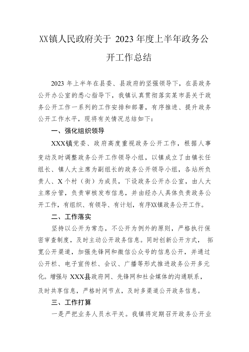 / 镇人民政府关于2023年度上半年政务公开工作总结(20230618)