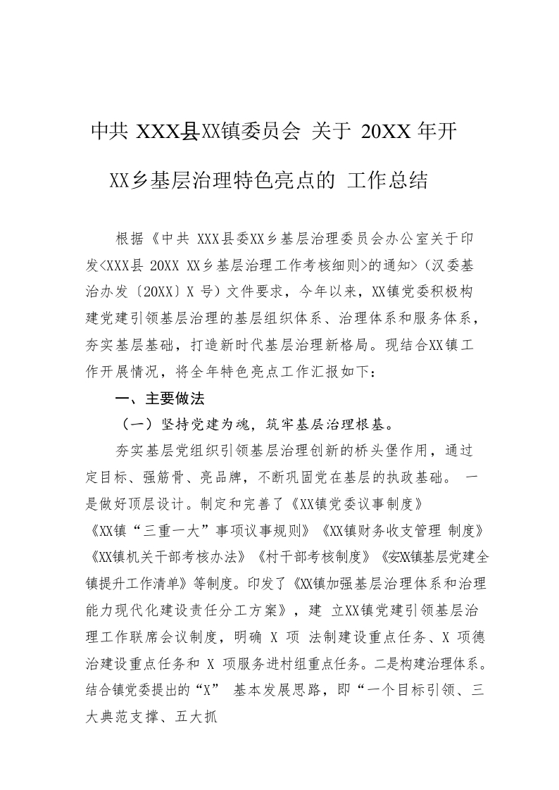 / 镇委员会 关于20XX年开展城乡基层治理特色亮点的 工作总结