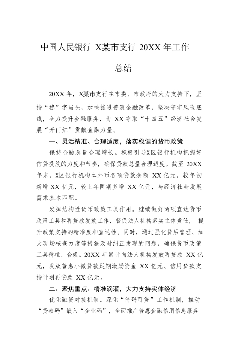 / 中国人民银行XX支行20XX年工作总结