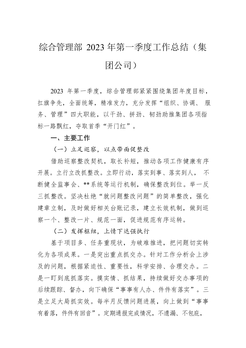 / 综合管理部2023年第一季度工作总结(集团公司)