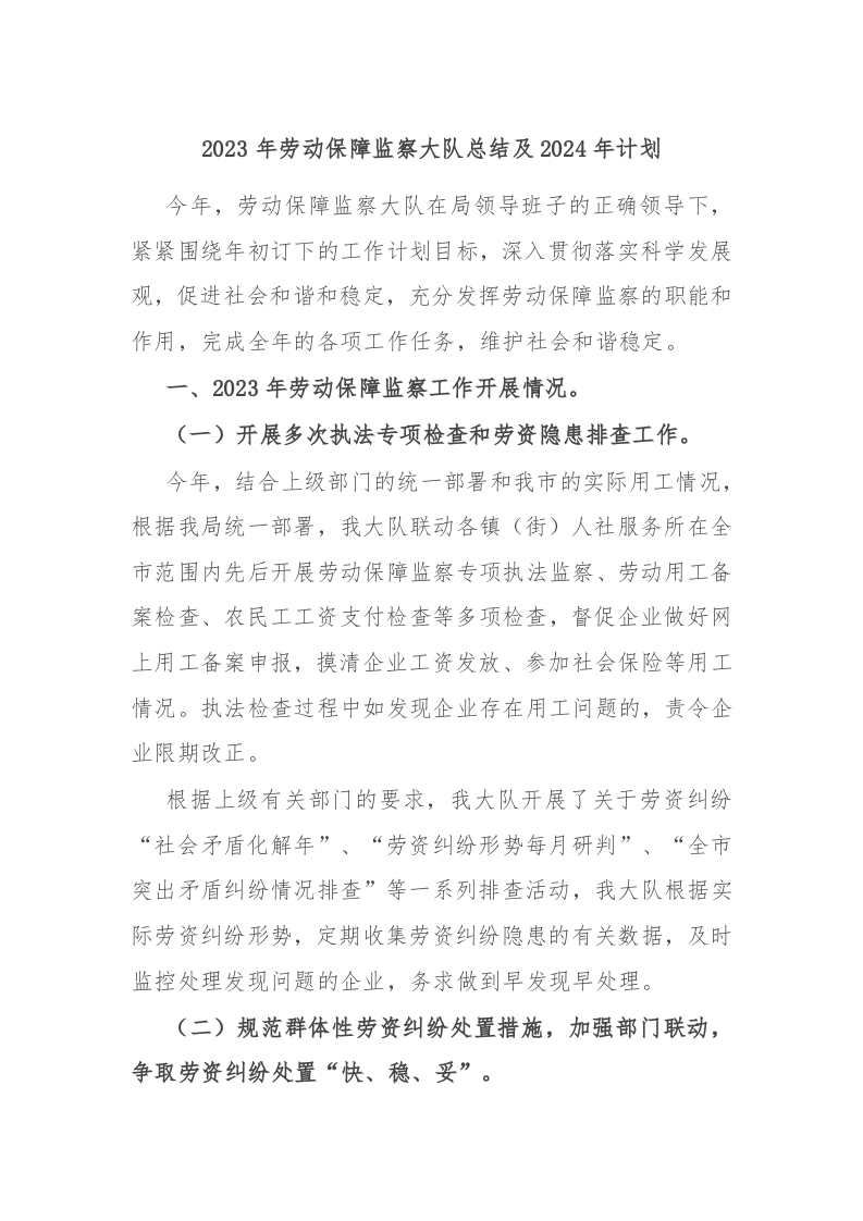 / 2023年劳动保障监察大队总结及2024年计划