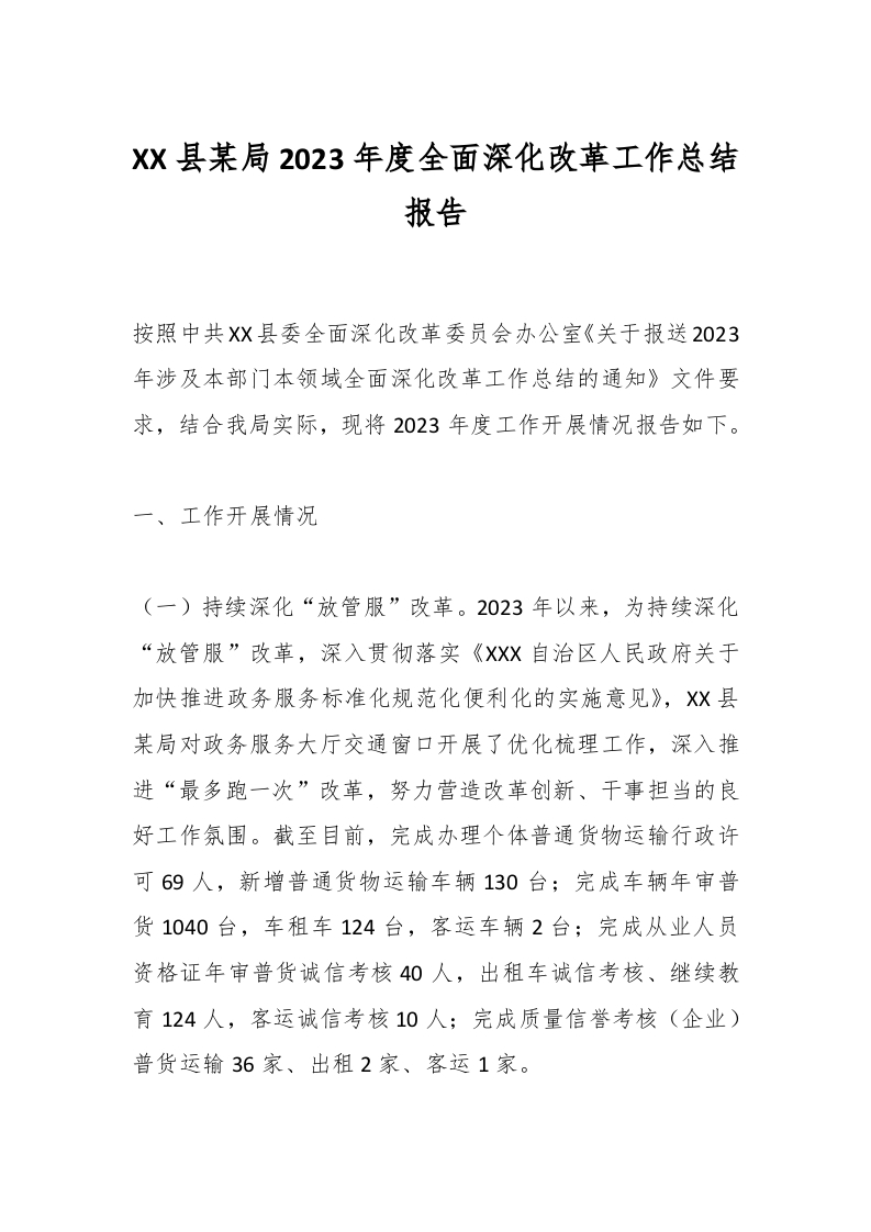 / XX县某局2023年度全面深化改革工作总结报告