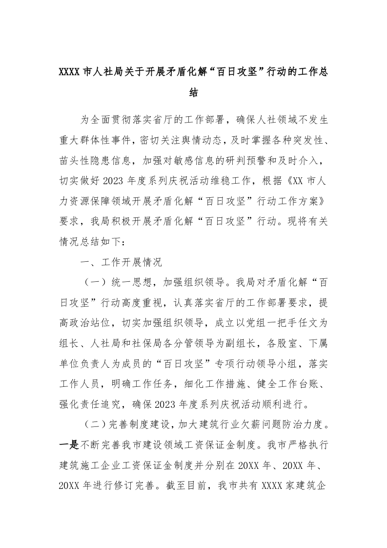 / XXXX市人社局关于开展矛盾化解“百日攻坚”行动的工作总结