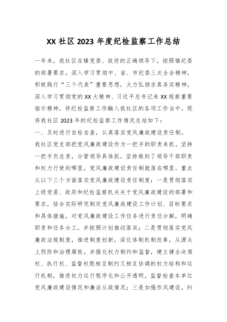 / XX社区2023年度纪检监察工作总结