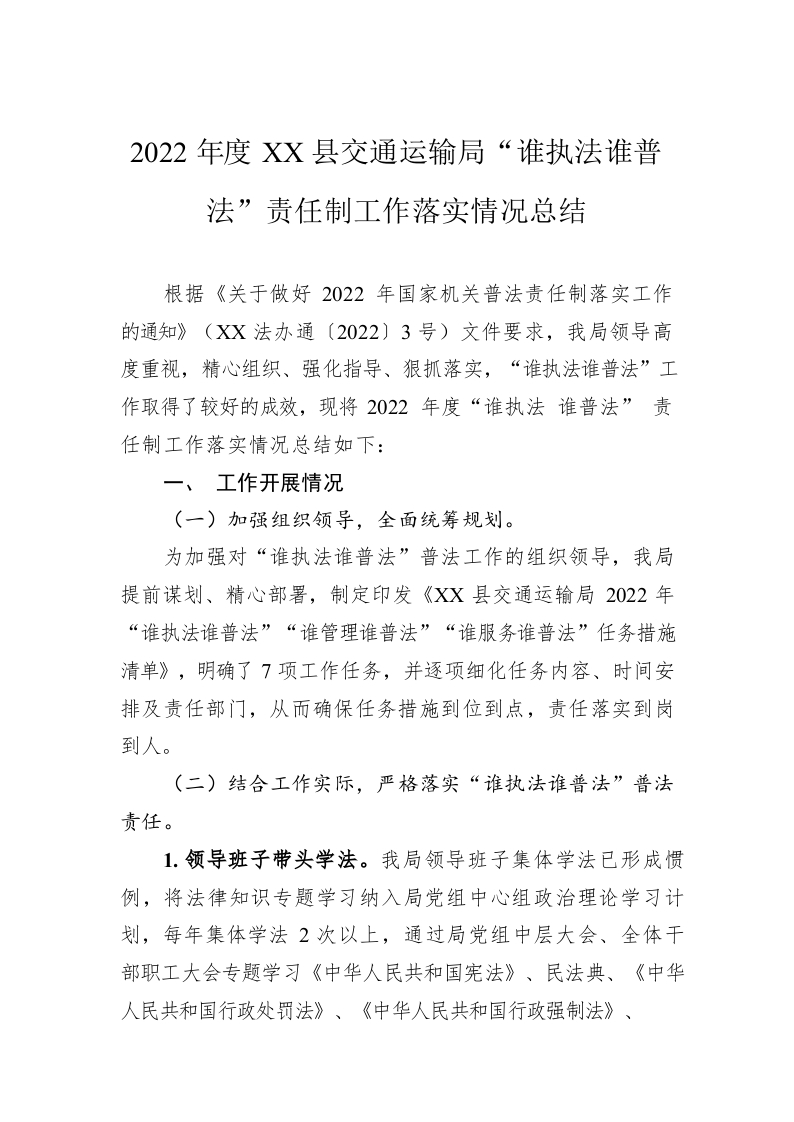 / 2022年度XX县交通运输局“谁执法谁普法”责任制工作落实情况总结(20221205)