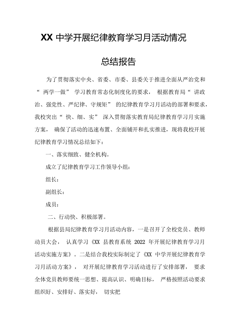 / XX中学开展纪律教育学习月活动情况总结报告