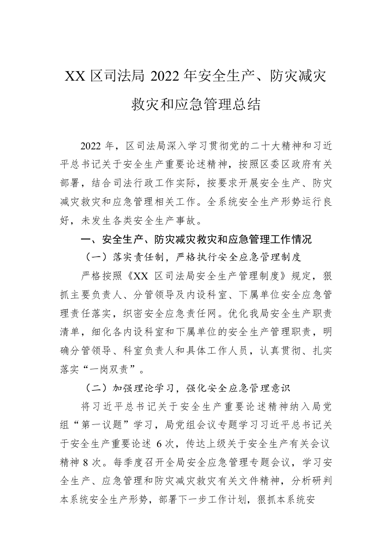 / XX区司法局2022年安全生产、防灾减灾救灾和应急管理总结(20221205)