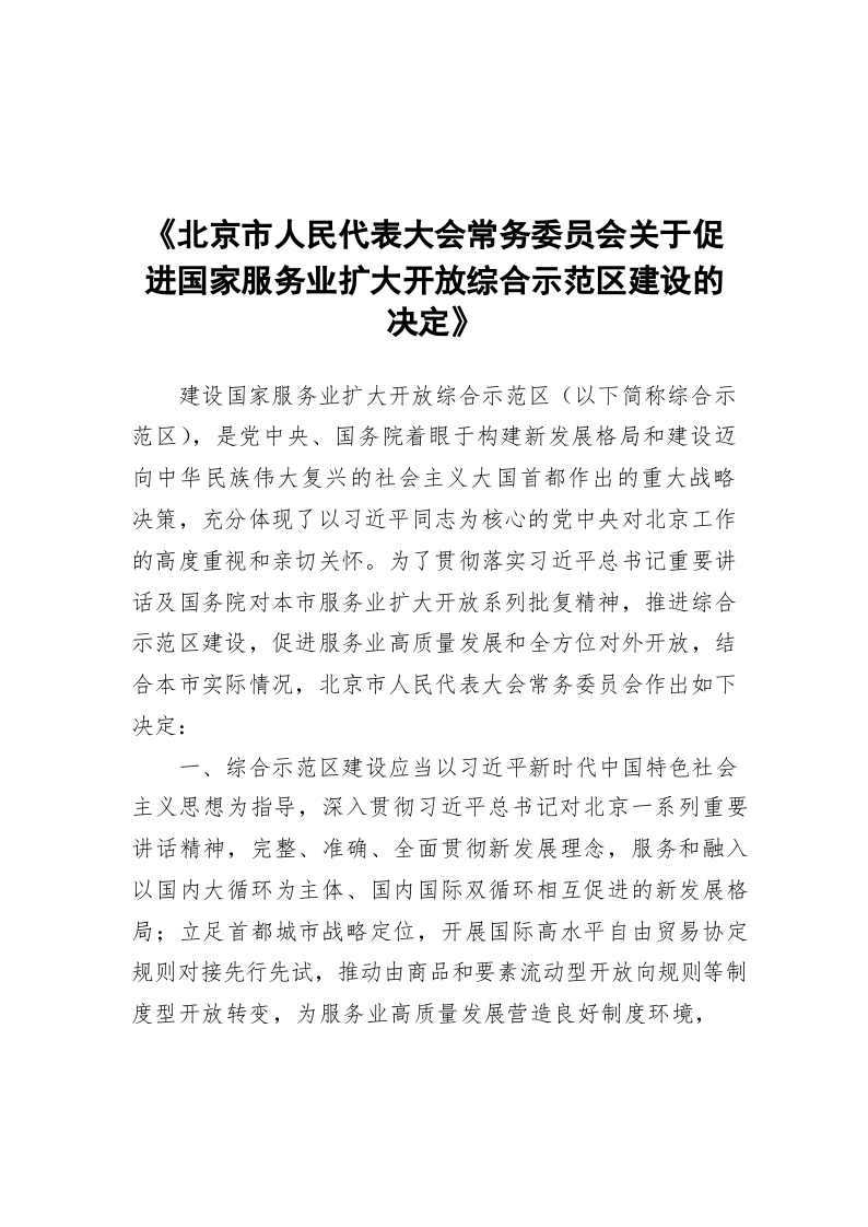 / 《北京市人民代表大会常务委员会关于促进国家服务业扩大开放综合示范区建设的决定》