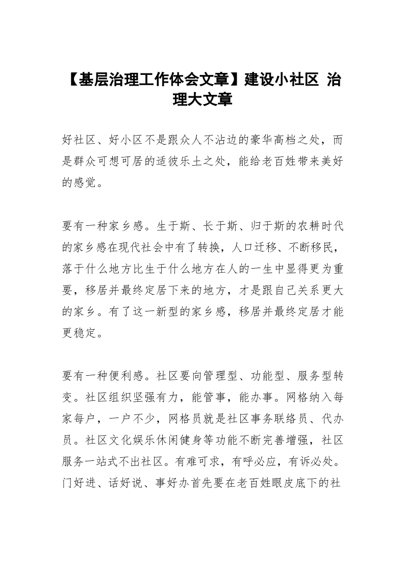 / 【基层治理工作体会文章】建设小社区 治理大文章