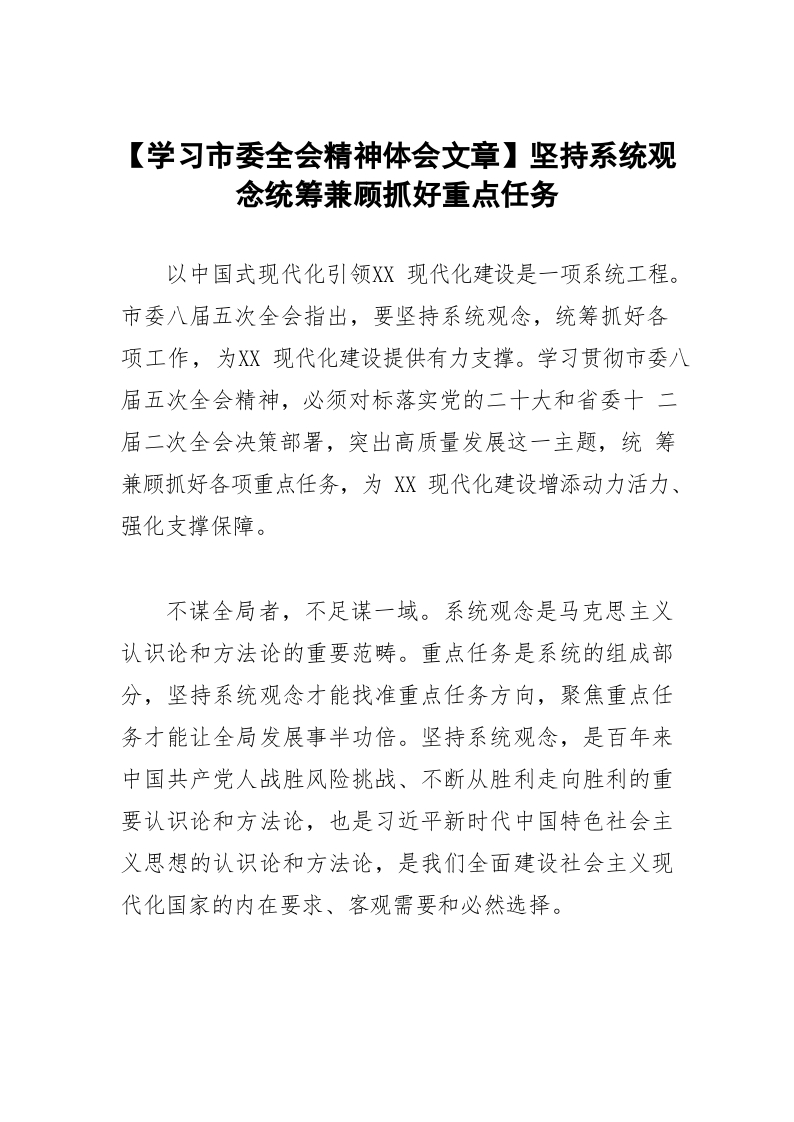 / 【学习市委全会精神体会文章】坚持系统观念统筹兼顾抓好重点任务