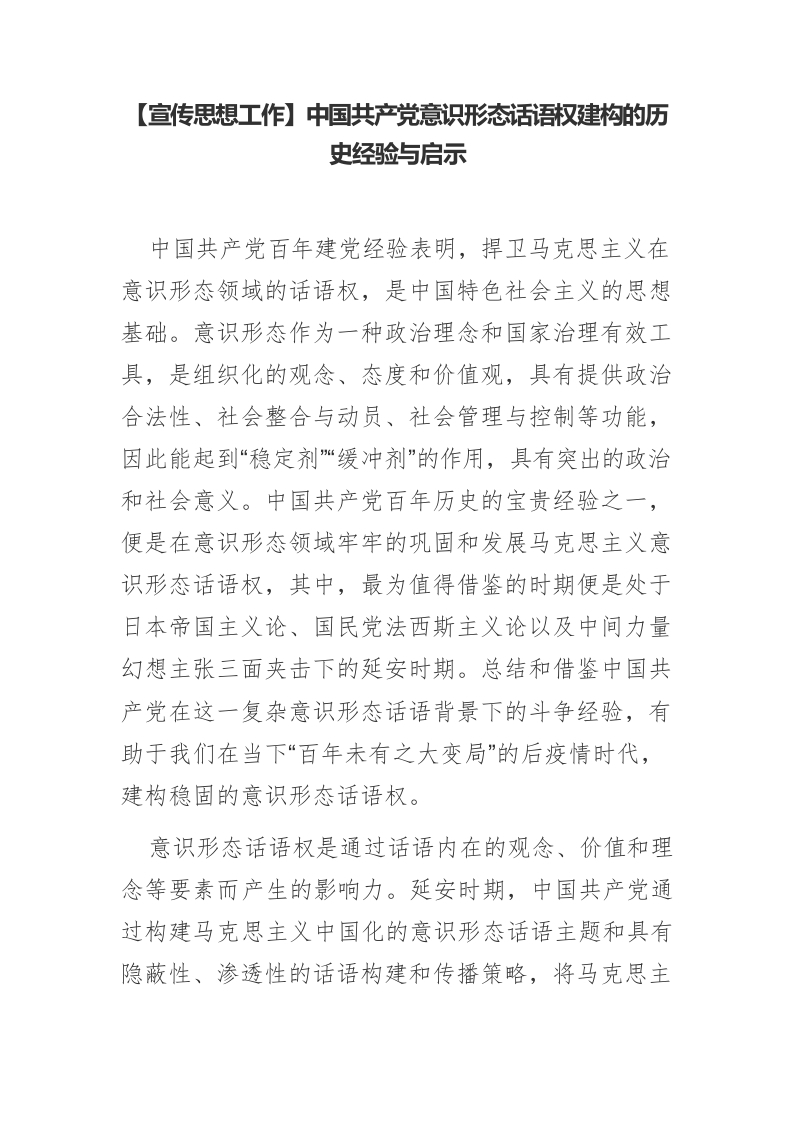 / 【宣传思想工作】中国共产党意识形态话语权建构的历史经验与启示