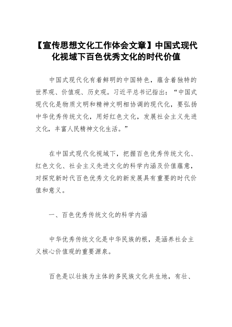 / 【宣传思想文化工作体会文章】中国式现代化视域下百色优秀文化的时代价值