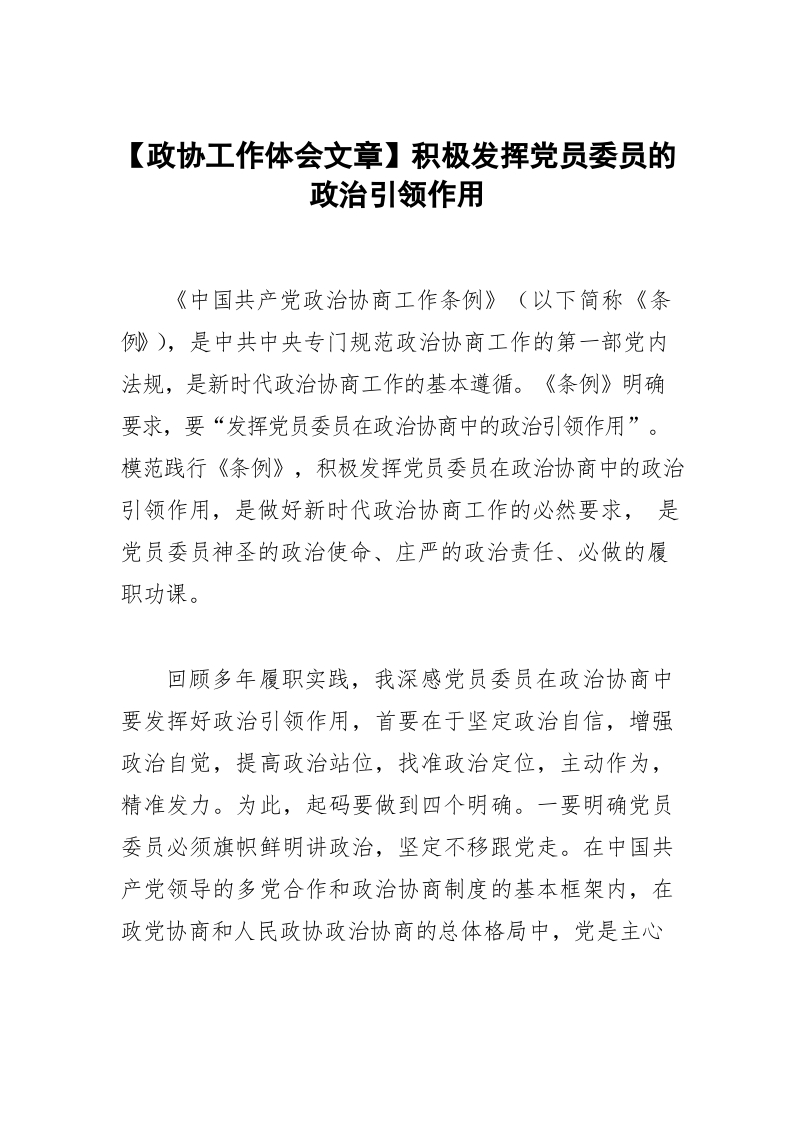【政协工作体会文章】积极发挥党员委员的政治引领作用